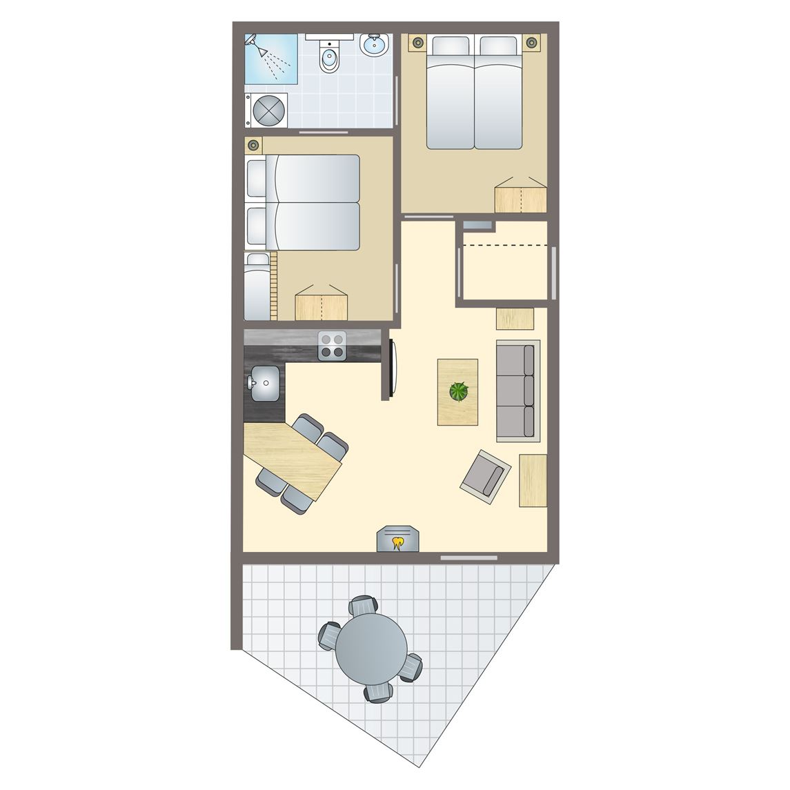gratis wifi,vernieuwd interieur,centrale of elektrische verwarming,binnendoorgang naar zwembad,in enkele accommodaties zijn huisdieren toegestaan,appartement,één slaapkamer,twee verdiepingen,rookvrij,circa 41 m²,flatscreen tv,2 persoonsbedbank,zithoek,eethoek,Kinderzitje (op aanvraag en tegen betaling),campingbedje (op aanvraag en tegen betaling),vide met 2 persoons boxspring,vide met 2 persoonsbed of twee 1 persoonsbedden,badkamer met vlakke douche, wastafel en toilet,koelkast met vriesvak,oven,standaard keukeninventaris,waterkoker,vaatwasser,filterkoffiezetapparaat,open keuken,keramische kookplaat (2 pits),terrasmeubilair,balkon,parkeren op de centrale parkeerplaats2 4 persoons appartement