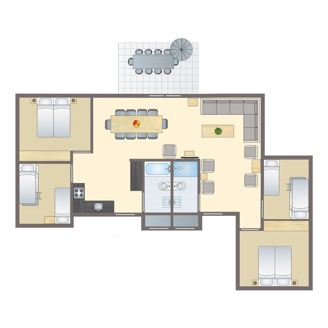 gratis wifi,modern interieur,inpandige berging,houten accommodatie,elektrische verwarming,vloerverwarming,huisdieren toegestaan,vrijstaand,drie slaapkamers,twee verdiepingen,rookvrij,Energy label A ,circa 100 m²,comfort,flatscreen tv,zithoek,eethoek,kinderstoel,houten ledikant,slaapkamer met twee 1 persoons boxsprings en softtopper op de begane grond,slaapkamer met twee 1 persoons boxsprings en softtopper op de eerste verdieping,slaapkamer met twee 1 persoons boxsprings op de eerste verdieping,bedden voorzien van dekbedden en hoofdkussens,badkamer en suite met inloopdouche en wastafel op de begane grond,Twee badkamers en suite met inloopdouche en wastafel op de eerste verdieping,apart toilet op de begane grond,apart toilet op de eerste verdieping,vaatwasser,combimagnetron,standaard keukeninventaris,koelkast met vriesvak,filterkoffiezetapparaat,Senseo koffiezetapparaat,open keuken,inductiekookplaat (4 pits),terras,parasol,terrasmeubilair,parkeren op de centrale parkeerplaats4 persoons appartement