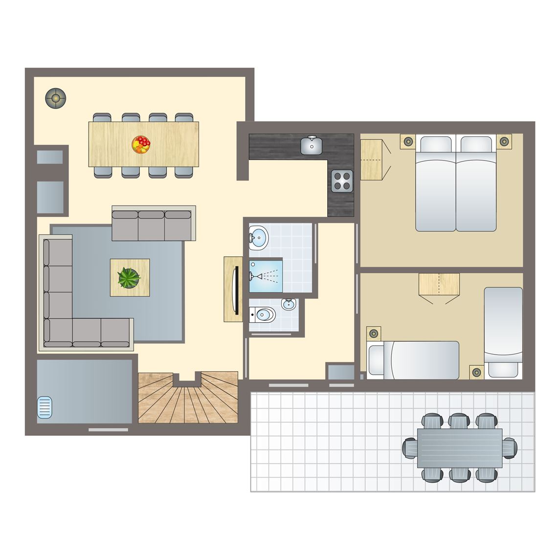 gratis wifi,modern interieur,bereikbaar via trap,geen lift aanwezig,elektrische verwarming,uitzicht op zee,rustige ligging,in enkele accommodaties zijn huisdieren toegestaan,geschakeld,twee slaapkamers,twee verdiepingen,rookvrij,circa 65 m²,flatscreen tv,zithoek,eethoek,Traphekjes (op aanvraag en tegen betaling),kinderstoel (op aanvraag, tegen betaling),campingbedje (op aanvraag en tegen betaling),twee slaapkamers met 2 persoonsbed of twee 1 persoonsbedden,vide met 2 persoonsbed of twee 1 persoonsbedden,bedden voorzien van dekbedden en hoofdkussens,badkamer met douche, wastafel en toilet,vaatwasser,koelkast met vriesvak,magnetron,standaard keukeninventaris,waterkoker,oven,filterkoffiezetapparaat,open keuken,keramische kookplaat (4 pits),terrasmeubilair,terras met uitzicht op het water