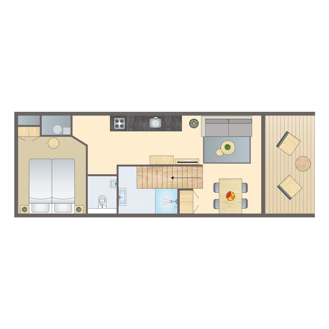 gratis wifi,modern interieur,elektrische verwarming,airconditioning,gelegen aan het water,geschikt voor maximaal twee volwassenen en twee kinderen,huisdiervrij,vrijstaand,twee slaapkamers,twee verdiepingen,rookvrij,Energy label G,circa 50 m²,flatscreen tv,zithoek,eethoek,kinderstoel,campingbedje,slaapkamer met 2 persoonsbed,vide met twee 1 persoonsbedden,bedden voorzien van dekbedden en hoofdkussens,badkamer met inloopdouche en wastafel op de begane grond,apart toilet,combimagnetron,koelkast met vriesvak,vaatwasser,waterkoker,Nespresso koffiemachine,filterkoffiezetapparaat,open keuken,inductiekookplaat,loungebank,tuinstoelen,tuintafel,terras,parkeren in de buurt van de accommodatie4 6 persoons safaritent
