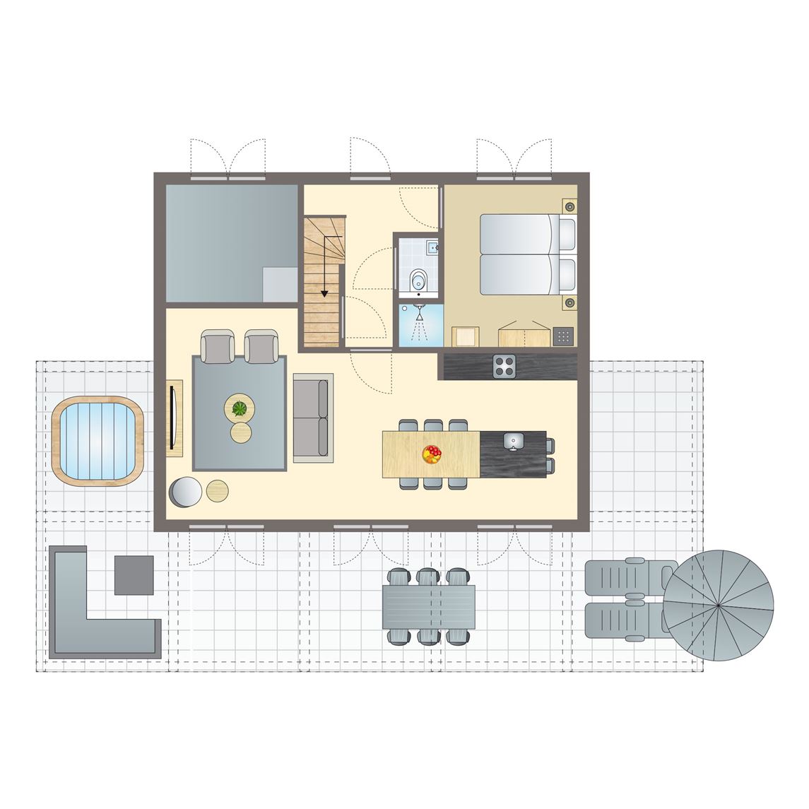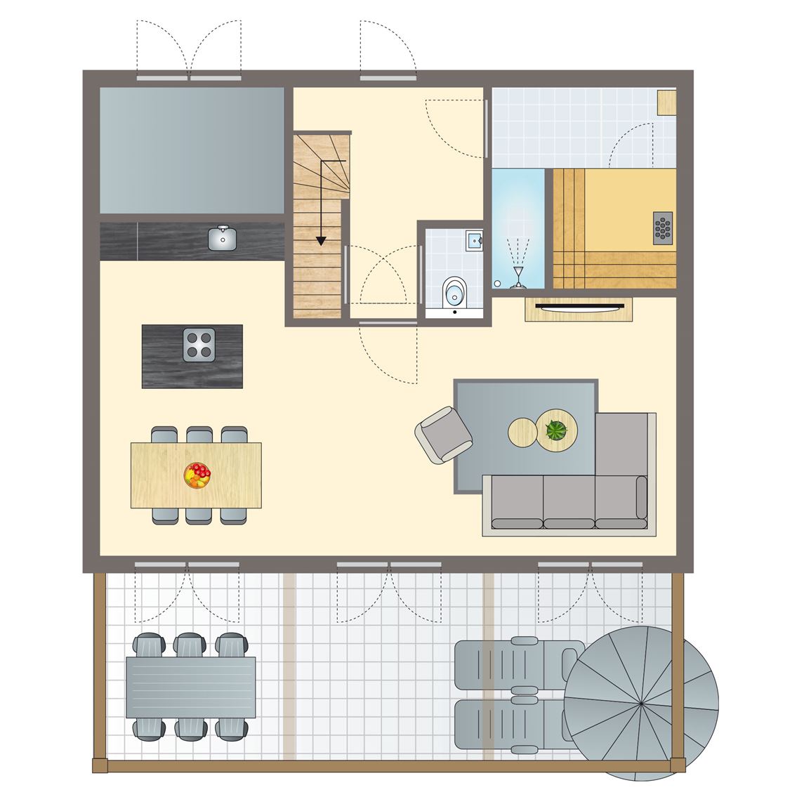 terras,deels verstelbaar terrasmeubilair,parasol,maximaal één auto parkeren bij de accommodatie,vaatwasser,combimagnetron,standaard keukeninventaris,koelkast met vriesvak,waterkoker,filterkoffiezetapparaat,Senseo koffiezetapparaat,gasplaat (4 pits),open keuken,centrale verwarming,houten accommodatie,uitpandige berging,in enkele accommodaties zijn huisdieren toegestaan,vrijstaand,gelijkvloers,Energy label E F,rookvrij,één slaapkamer,circa 63 m²,apart toilet,thermostaatkranen,badkamer en suite met douchecabine en wastafel,eethoek,zithoek,flatscreen tv,Kinderzitje (op aanvraag en tegen betaling),campingbedje (op aanvraag en tegen betaling),kindveilige stopcontacten,slaapkamer met twee 1 persoons boxsprings en softtopper,bedden voorzien van dekbedden en hoofdkussens6 persoons hoevewoning