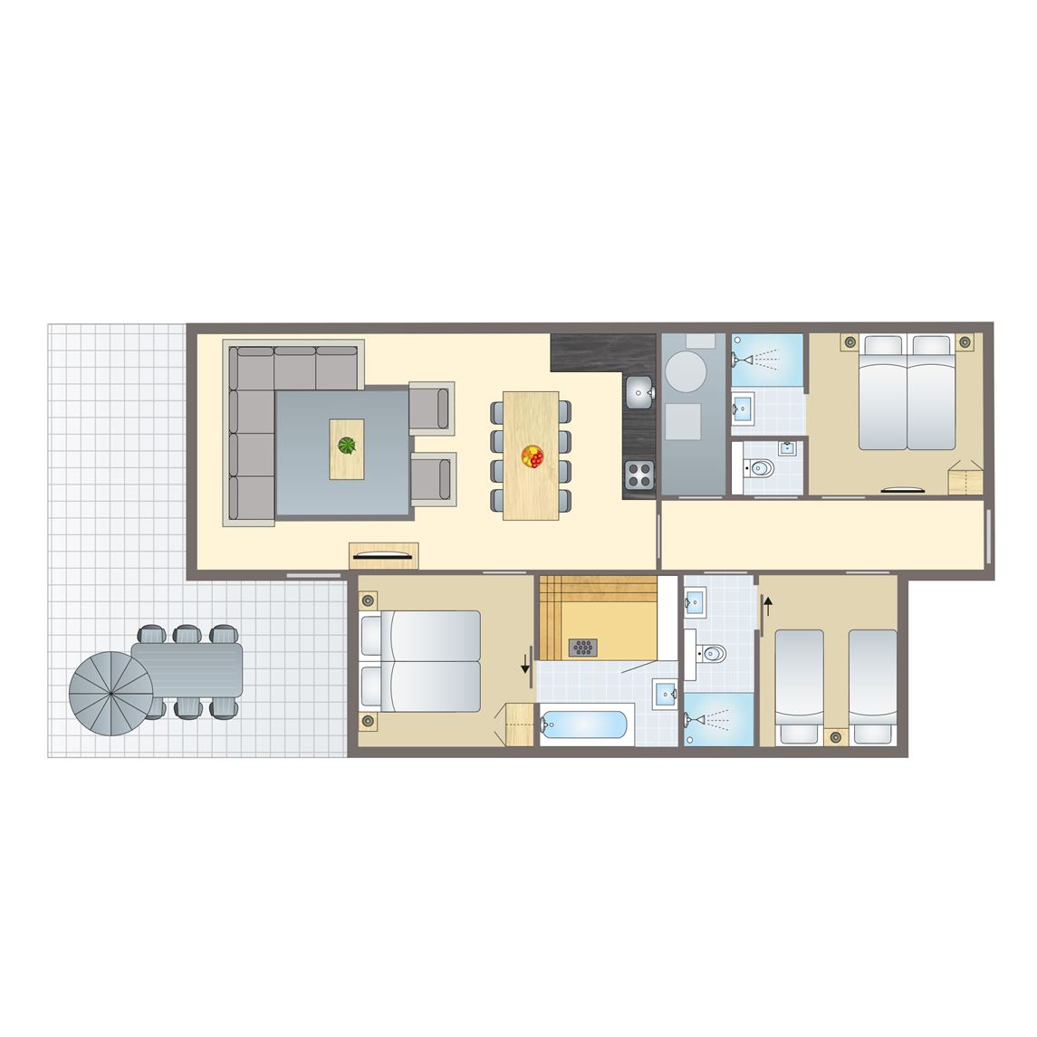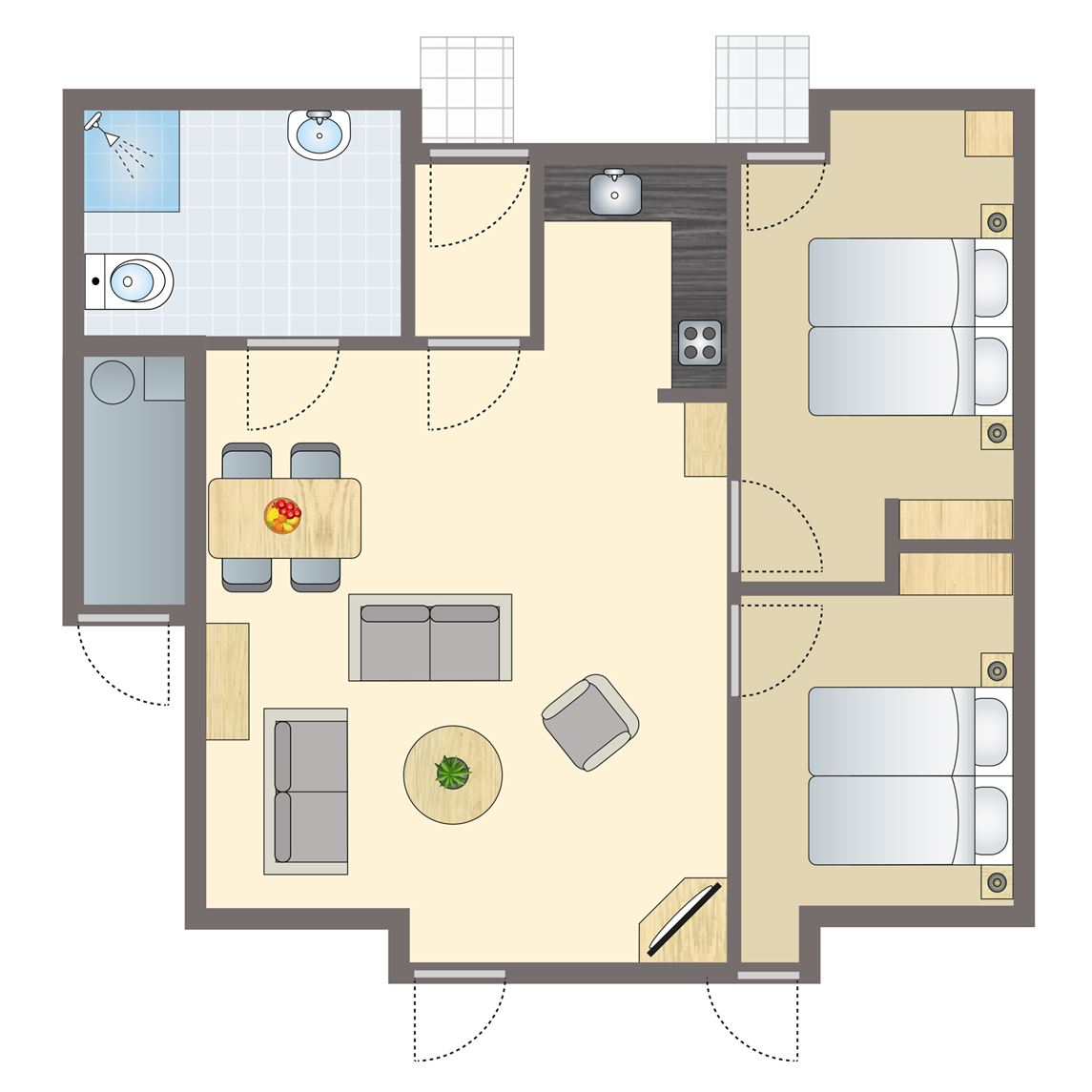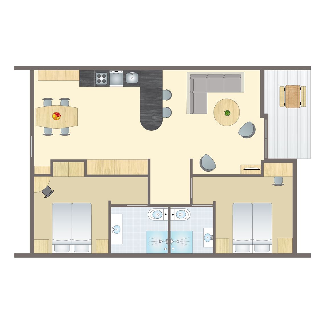 gratis wifi,luxueus interieur,bereikbaar via trap,geen lift aanwezig,centrale verwarming,gelegen op de begane grond of eerste verdieping,op voorkeur te reserveren begane grond of eerste verdieping,in enkele accommodaties zijn huisdieren toegestaan,appartement,twee slaapkamers,gelijkvloers,rookvrij,circa 65 m²,comfort,blu ray speler,cd speler,flatscreen tv,MP3 speler,radio,2 persoonsbedbank,fauteuil,bio ethanol sfeerhaard,eetkamerstoelen,eettafel,kinderstoel,campingbedje,twee slaapkamers met 2 persoonsbed en flatscreen tv,bedbank,bedden voorzien van dekbedden en hoofdkussens,wellness badkamer met vlakke, dubbele rain stoomdouche, dubbele wastafel en toilet,föhn,koelkast met vriesvak,magnetron,oven,standaard keukeninventaris,vaatwasser,waterkoker,Nespresso koffiemachine,filterkoffiezetapparaat,open keuken,keramische kookplaat (4 pits),terras of balkon,tuinstoelen,tuintafel,Barbecueën is niet toegestaan bij deze accommodatie,parkeerplek voor 1 auto in de parkeergarage op de parkeerplaats,Kort parkeren voor in en uitladen in de buurt mogelijk2 4 persoons appartement Extra toegankelijk