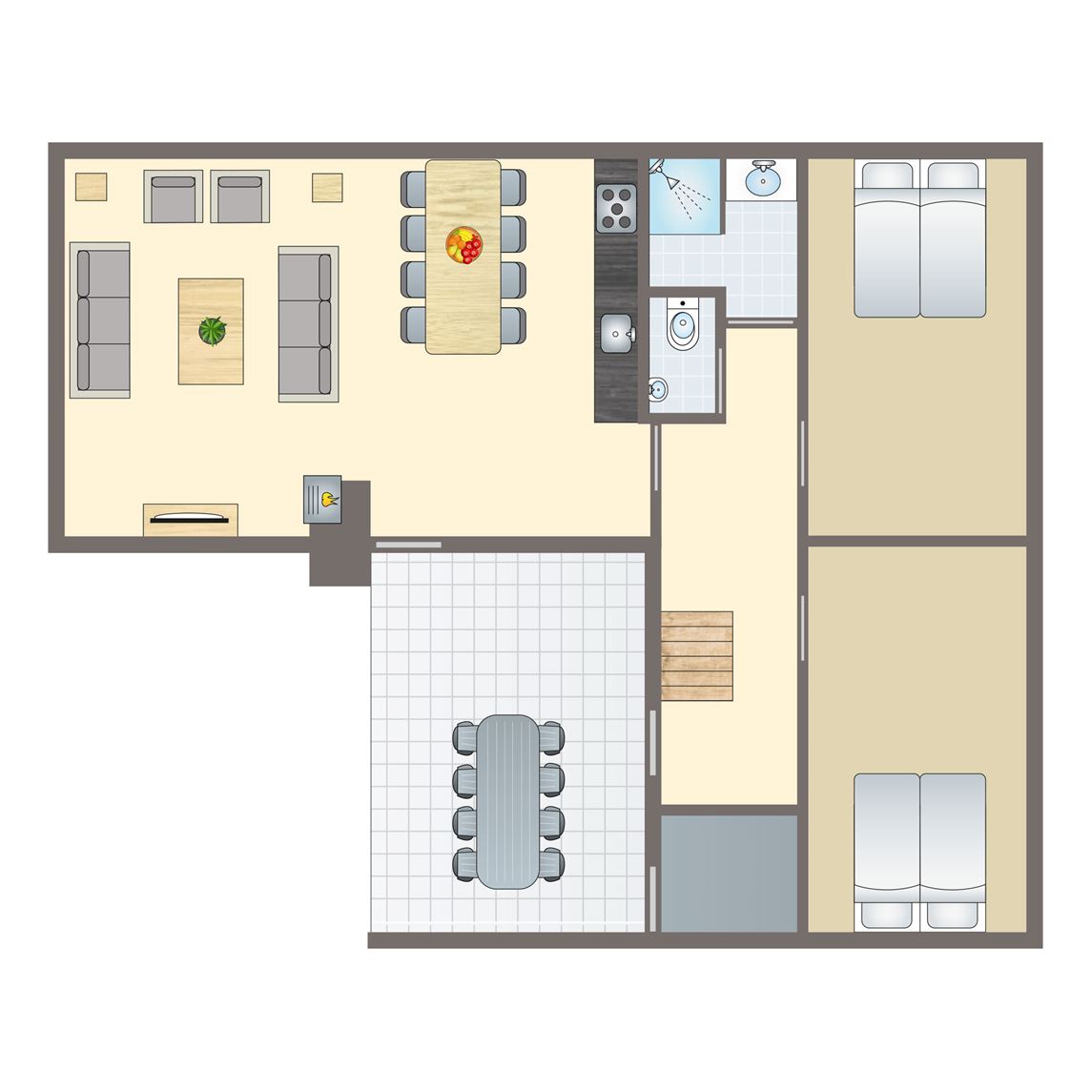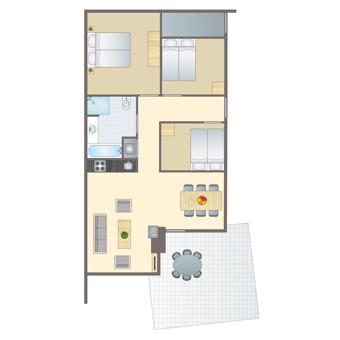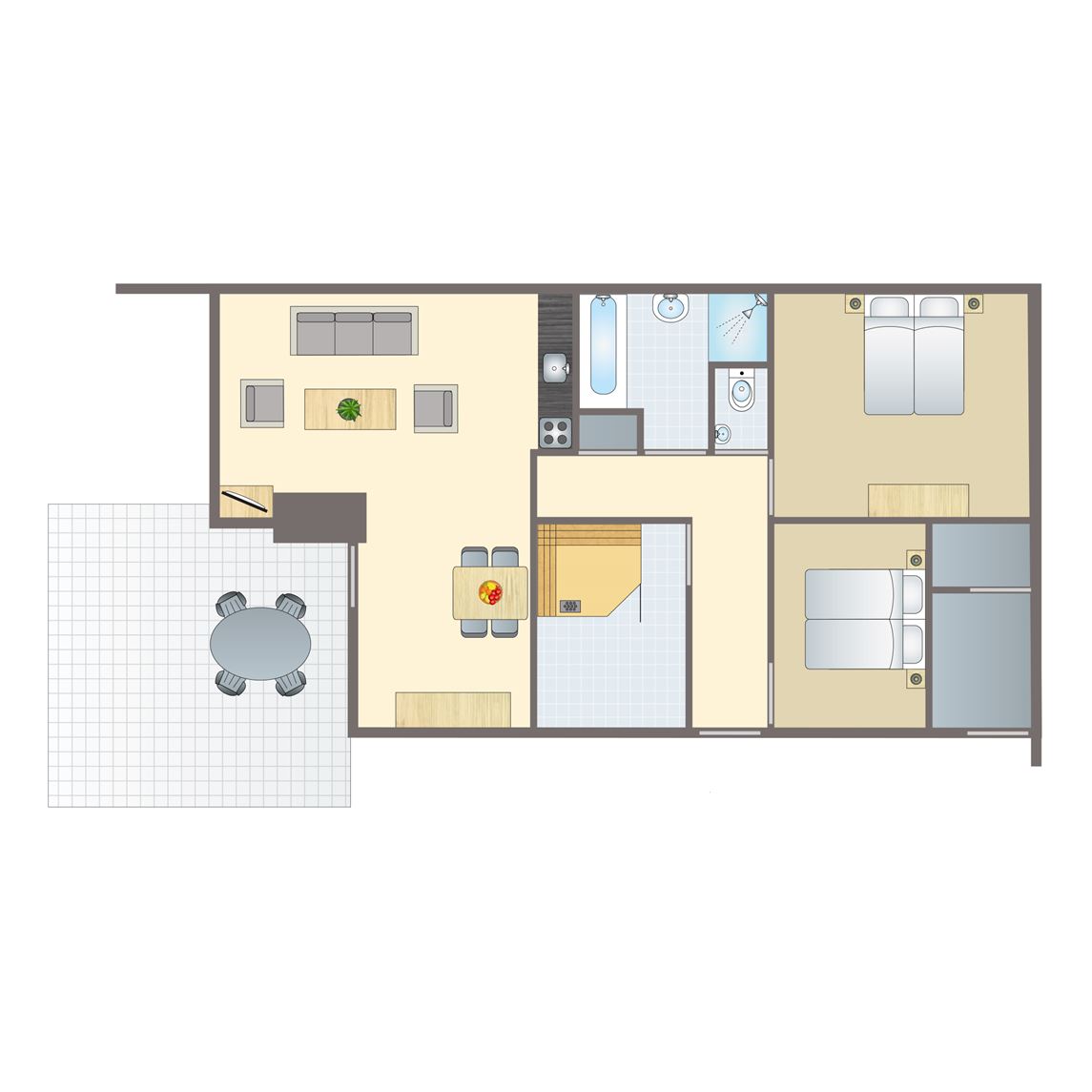 gratis wifi,bereikbaar via trap,inpandige berging,centrale verwarming,huisdiervrij,appartement,drie slaapkamers,gelijkvloers,circa 80 m²,comfort,flatscreen tv,2 persoonsbedbank,zithoek,eethoek,kindveilige stopcontacten,kinderstoel,campingbedje (op aanvraag en tegen betaling),slaapkamer met twee 1 persoons boxsprings, 2 persoonssofttopper en flatscreen tv,twee slaapkamers met twee 1 persoons boxsprings,bedden voorzien van dekbedden en hoofdkussens,badkamer met douchecabine, dubbele wastafel en toilet,vaatwasser,oven,magnetron,koelkast met vriesvak,standaard keukeninventaris,waterkoker,filterkoffiezetapparaat,Senseo koffiezetapparaat,open keuken,keramische kookplaat,deels verstelbaar terrasmeubilair,terras of balkon,parkeren op de centrale parkeerplaats4 persoons woning