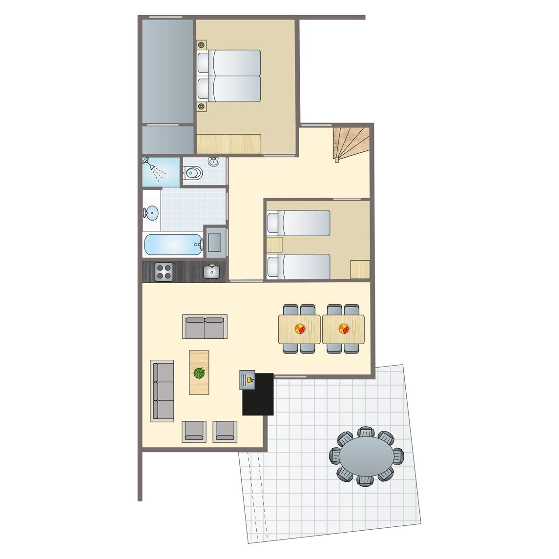 gratis wifi,bereikbaar via trap,inpandige berging,centrale verwarming,gelegen tegen op een helling,in enkele accommodaties zijn huisdieren toegestaan,appartement,twee slaapkamers,gelijkvloers,circa 80 m²,comfort,flatscreen tv,zithoek,eethoek,kindveilige stopcontacten,kinderstoel,campingbedje (op aanvraag en tegen betaling),slaapkamer met twee 1 persoons boxsprings,slaapkamer met twee 1 persoons boxsprings, 2 persoonssofttopper en flatscreen tv,bedden voorzien van dekbedden en hoofdkussens,badkamer met douchecabine, dubbele wastafel en toilet,op voorkeur te reserveren tweede toilet,vaatwasser,oven,magnetron,koelkast met vriesvak,standaard keukeninventaris,waterkoker,filterkoffiezetapparaat,Senseo koffiezetapparaat,open keuken,keramische kookplaat,terras,deels verstelbaar terrasmeubilair,parkeren op de centrale parkeerplaats4 6 persoons woning