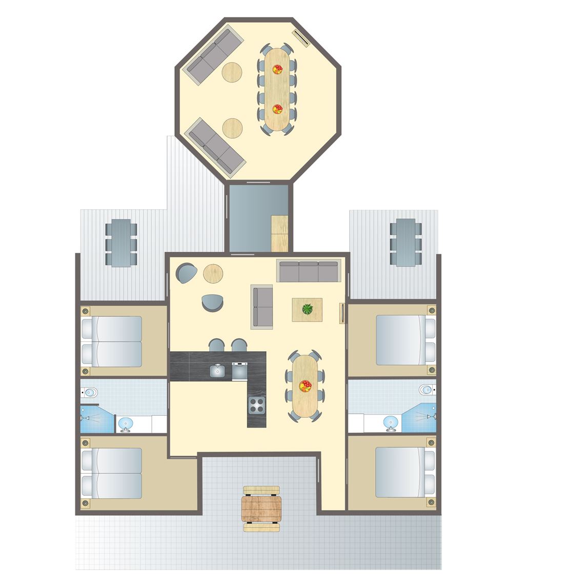gratis wifi,inpandige berging,uitpandige berging,rietgedekte accommodatie,centrale verwarming,huisdiervrij,geschakeld,twaalf slaapkamers,twee verdiepingen,rookvrij,Energy label A,circa 368 m²,comfort,vier LED flatscreen tv's,vier blu ray spelers,zithoek,twee gashaarden,eethoek,Kindveilige stopcontacten (van binnenuit beveiligd),traphekje,vier kinderstoelen,campingbedje (op aanvraag),kinderservies,vier slaapkamers met 2 persoons Auping boxspring (2 persoonsdekbed) en flatscreen tv op de eerste verdieping,acht slaapkamers met twee 1 persoons boxsprings op de eerste verdieping,opgemaakte bedden bij aankomst,bedden voorzien van dekbedden en hoofdkussens,vier badkamers met ligbad, douchecabine, wastafel en toilet,handdoekenpakket per persoon,vier aparte toiletten op de begane grond,wasmachine,wasdroger,föhn,keukendoekenpakket,servicepakket,koffie en theepakket,twee vaatwassers,bar,twee combimagnetrons,waterkoker,standaard keukeninventaris,elektrische citruspers,koelkast met vriesvak,Nespresso koffiemachine,filterkoffiezetapparaat,open keuken,twee gasplaten (5 pits),twee terrassen,verstelbaar terrasmeubilair,parasol,openslaande tuindeuren,parkeren op de centrale parkeerplaats8 persoons bungalow
