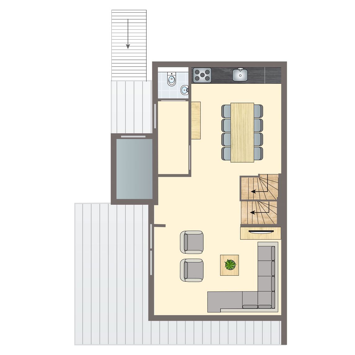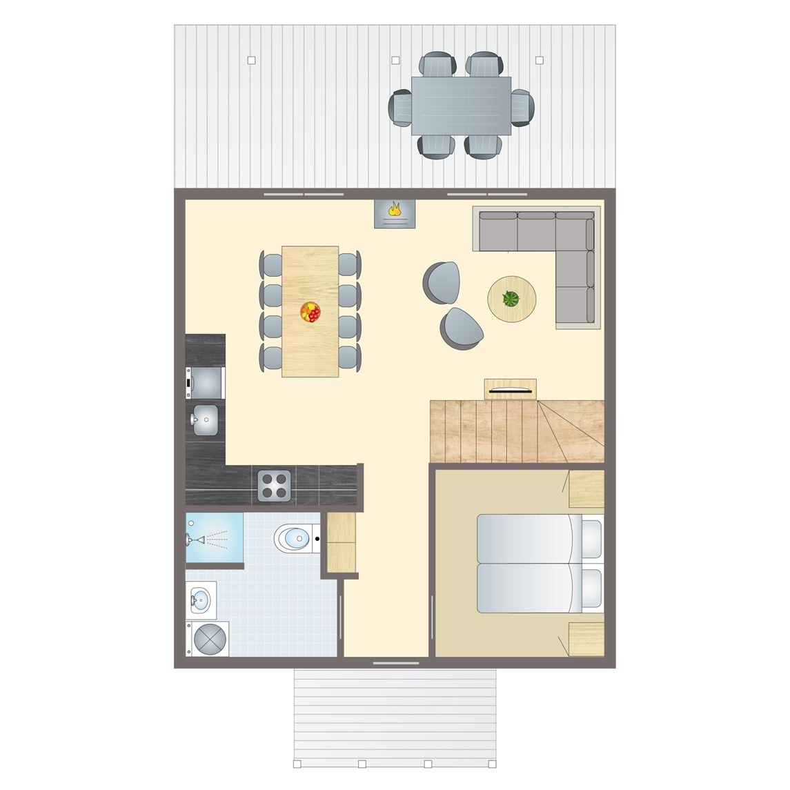 standaard interieur,Dit type is minder geschikt voor mensen die lichamelijk beperkt of slecht ter been zijn,enkele traptreden naar accommodatie,houten accommodatie,airconditioning,vloerverwarming,gelegen in een bosrijke omgeving,geschikt voor 2 volwassenen en 2 kinderen,één huisdier toegestaan,vrijstaand,twee verdiepingen,11.5 m² 20 m²,eethoek,zithoek,koelkast met vriesvak,standaard keukeninventaris,oven,Nespresso koffiemachine,gasplaat (4 pits),open keuken,Kinderzitje (op aanvraag en tegen betaling),picknicktafel,tuinstoelen,parkeren op de centrale parkeerplaats,bedden voorzien van dekbedden en hoofdkussens,2 persoonsbed op de vide,2 persoonsbedbank in de woonkamer,badkamer met douchecabine, wastafel en toilet8 persoons appartement