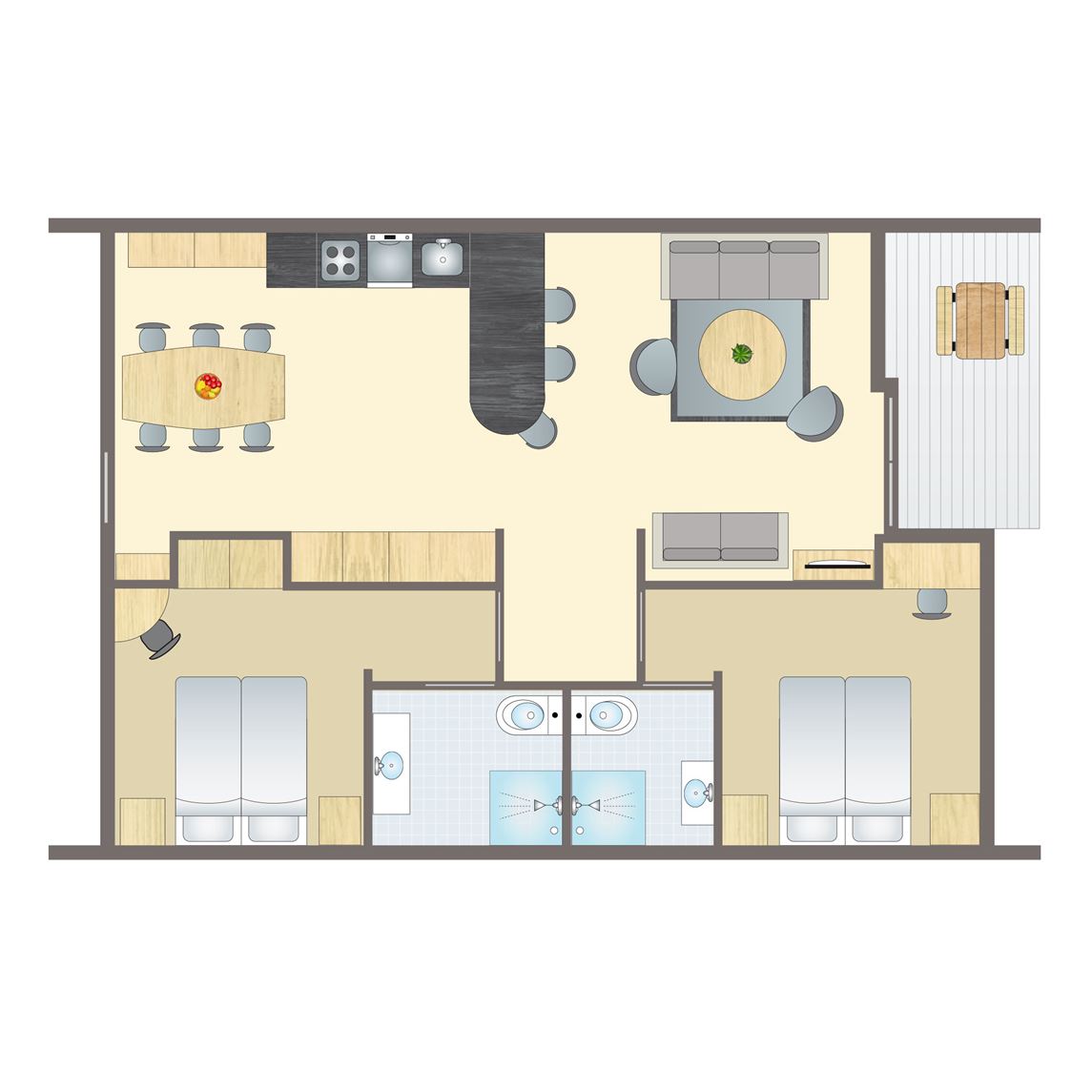 gratis wifi,centrale verwarming,huisdiervrij,appartement,twee slaapkamers,gelijkvloers,rookvrij,Energy label A B,circa 83 m²,comfort,flatscreen tv,Multimediaspeler,zithoek,eethoek,kinderstoel,campingbedje,slaapkamer met twee 1 persoons boxsprings en softtopper,slaapkamer met twee 1 persoons boxsprings,bedden voorzien van dekbedden en hoofdkussens,badkamer met douchecabine en dubbele wastafel,apart toilet,thermostaatkranen,vaatwasser,combimagnetron,standaard keukeninventaris,koelkast met vriesvak,waterkoker,Nespresso koffiemachine,filterkoffiezetapparaat,open keuken,gasplaat (4 pits),terras of balkon,deels verstelbaar terrasmeubilair,parasol of zonnescherm,openslaande tuindeuren,parkeren op de centrale parkeerplaats6 persoons vakantiehuis