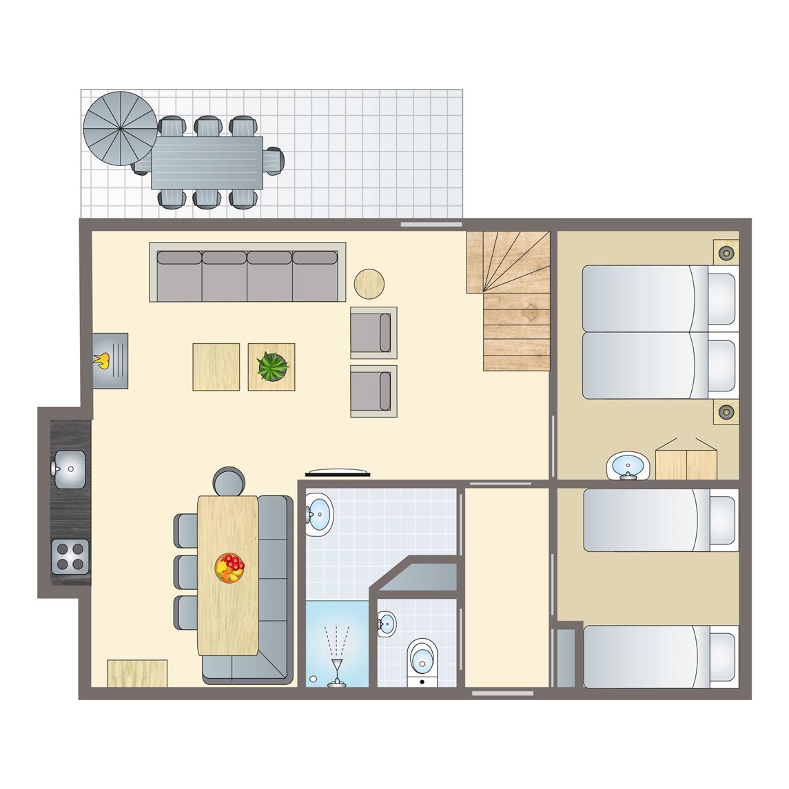 Gratis wifi,vernieuwd interieur,houten accommodatie,centrale of elektrische verwarming,huisdiervrij,geschakeld,twee slaapkamers,twee verdiepingen,rookvrij,circa 53 m²,comfort,tv,zithoek,eethoek,Kinderzitje (op aanvraag en tegen betaling),campingbedje (op aanvraag en tegen betaling),een kinderbed kan uitsluitend in de woonkamer geplaatst worden,twee slaapkamers met 2 persoonsbed of twee 1 persoonsbedden,vide is alleen geschikt voor kinderen en heeft een open verbinding naar de woonkamer,vide met twee losse matrassen,bedden voorzien van dekbedden en hoofdkussens,badkamer met vlakke douche, wastafel en toilet,oven,koelkast met vriesvak,standaard keukeninventaris,vaatwasser,waterkoker,magnetron,filterkoffiezetapparaat,open keuken,keramische kookplaat (4 pits),terras,terrasmeubilair,picknicktafel,parkeren in de buurt van de accommodatie6 persoons bungalow