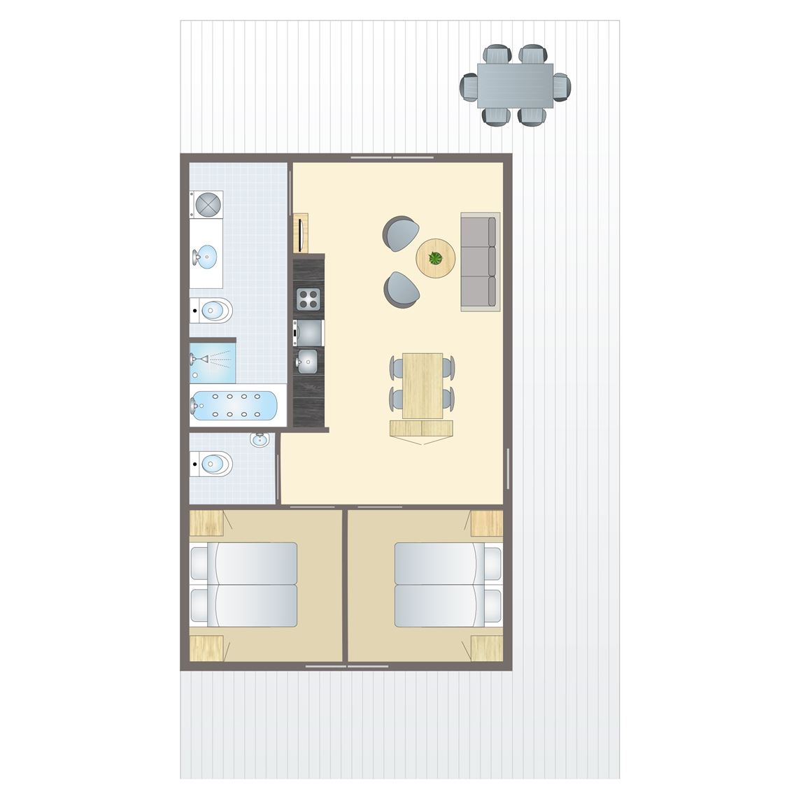 flatscreen tv,zithoek,houtkachel,eethoek,kindveilige stopcontacten,kinderstoel,campingbedje,Een campingbedje kan uitsluitend in de woonkamer geplaatst worden,slaapkamer met twee 1 persoons boxsprings, 2 persoonssofttopper, wastafel en flatscreen tv,twee slaapkamers met twee 1 persoons boxsprings,bedden voorzien van dekbedden en hoofdkussens,badkamer met ligbad, douchecabine en dubbele wastafel,apart toilet,thermostaatkranen,oven,vaatwasser,magnetron,koelkast met vriesvak,standaard keukeninventaris,waterkoker,filterkoffiezetapparaat,Senseo koffiezetapparaat,open keuken,gasplaat (4 pits),terras,deels verstelbaar terrasmeubilair,parasol,maximaal één auto parkeren bij de accommodatie,centrale verwarming,in enkele accommodaties zijn huisdieren toegestaan,2 onder 1 kap,drie slaapkamers,gelijkvloers,rookvrij,circa 60 m²2 persoons bungalow