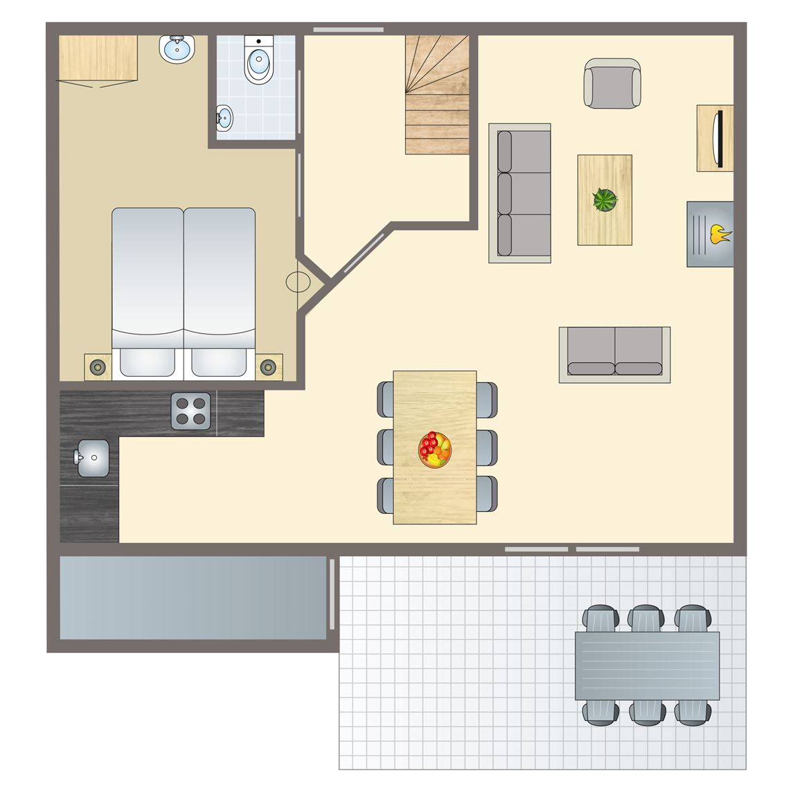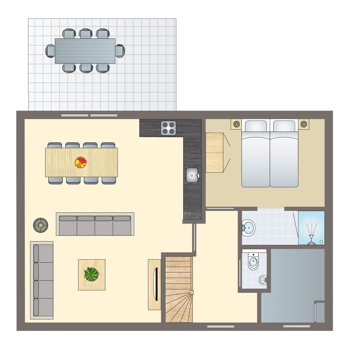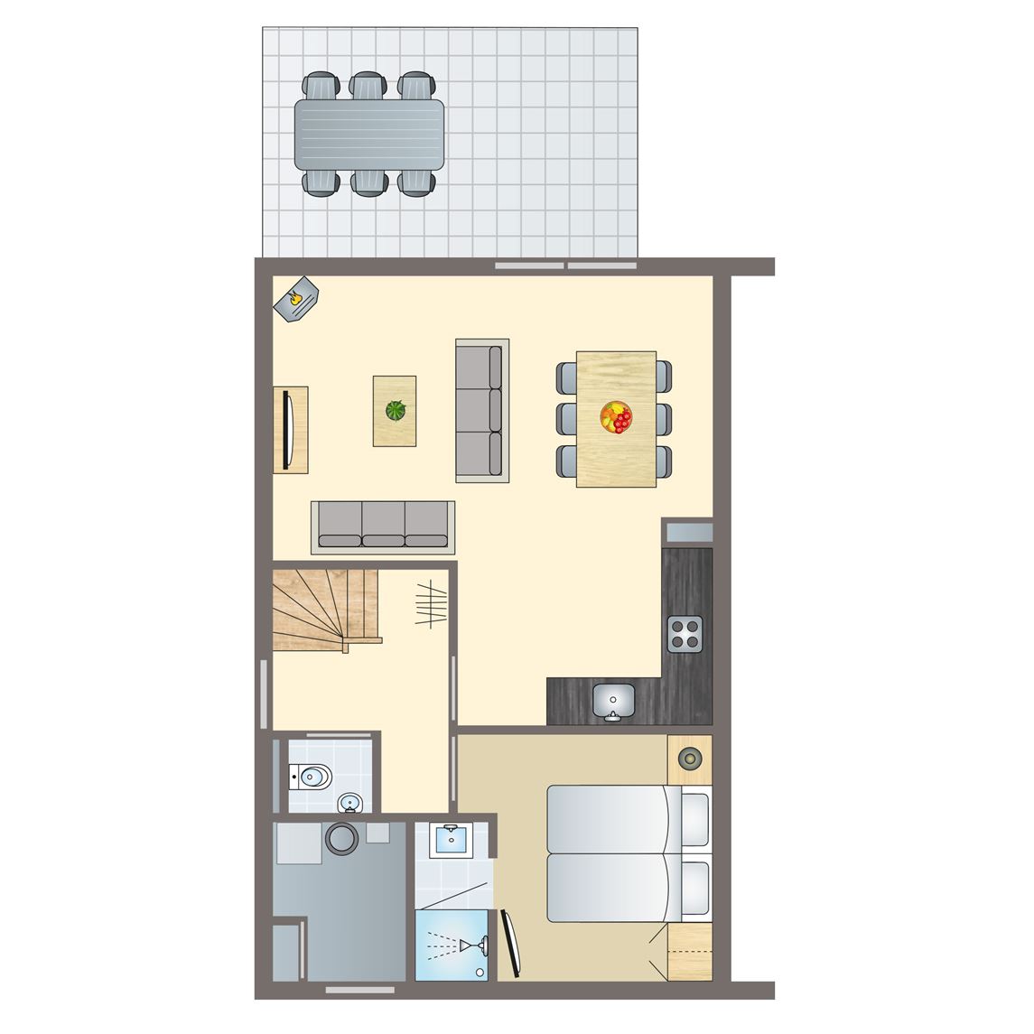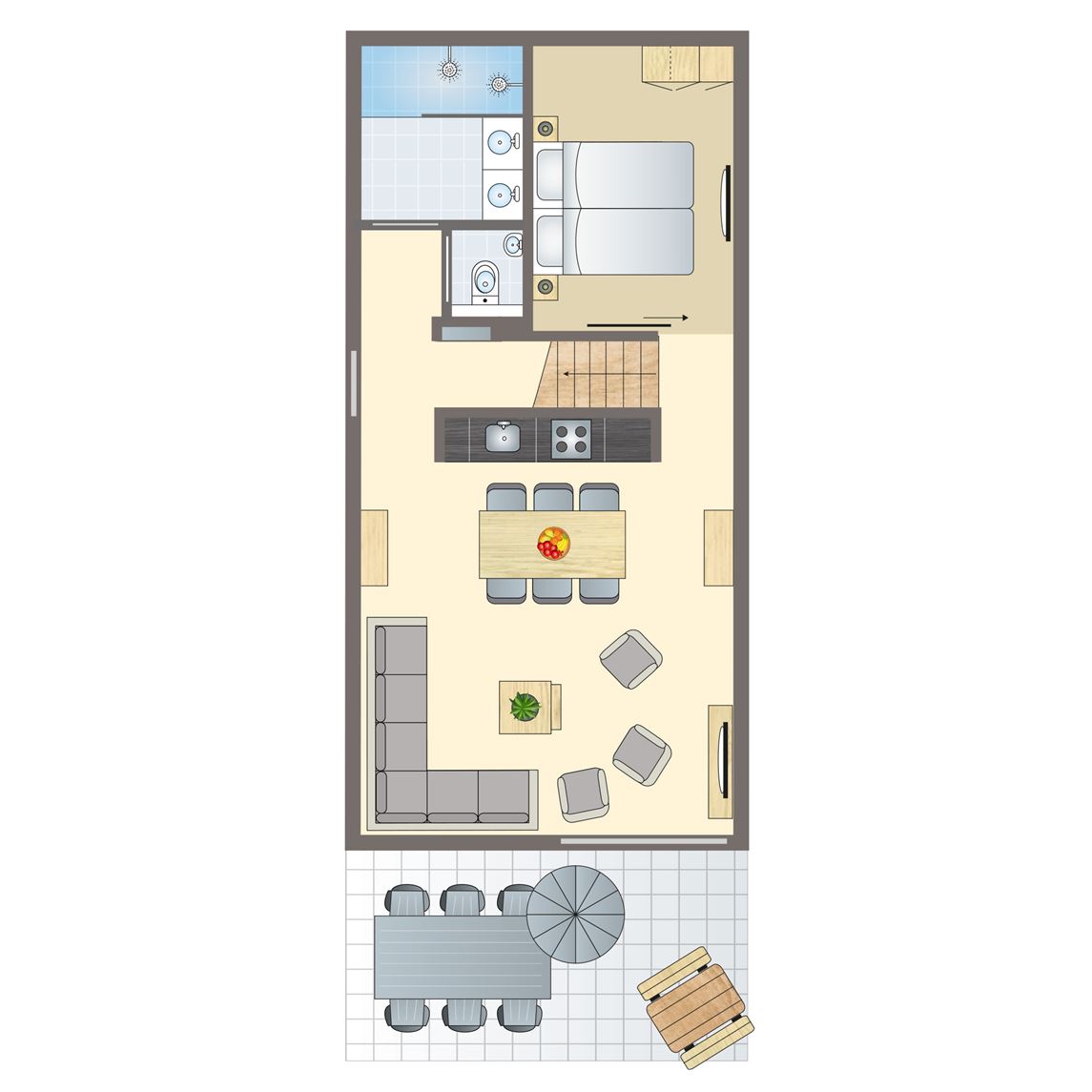 gratis wifi,standaard interieur,stenen accommodatie,centrale of elektrische verwarming,huisdiervrij,appartement,één slaapkamer,gelijkvloers,rookvrij,25 m²,Kinderzitje (op aanvraag en tegen betaling),campingbedje (op aanvraag),op voorkeur te reserveren houtkachel,slaapkamer met 2 persoonsbed of twee 1 persoonsbedden, flatscreen tv en twee fauteuils,bedden voorzien van dekbedden en hoofdkussens,badkamer met douche, wastafel en toilet,badkamer en suite met douchecabine, wastafel en toilet,standaard keukeninventaris,koelkast met vriesvak,waterkoker,filterkoffiezetapparaat,open keuken,keramische kookplaat (2 pits),gedeeld terras,terrasmeubilair,parkeren op de centrale parkeerplaats8 persoons bungalow