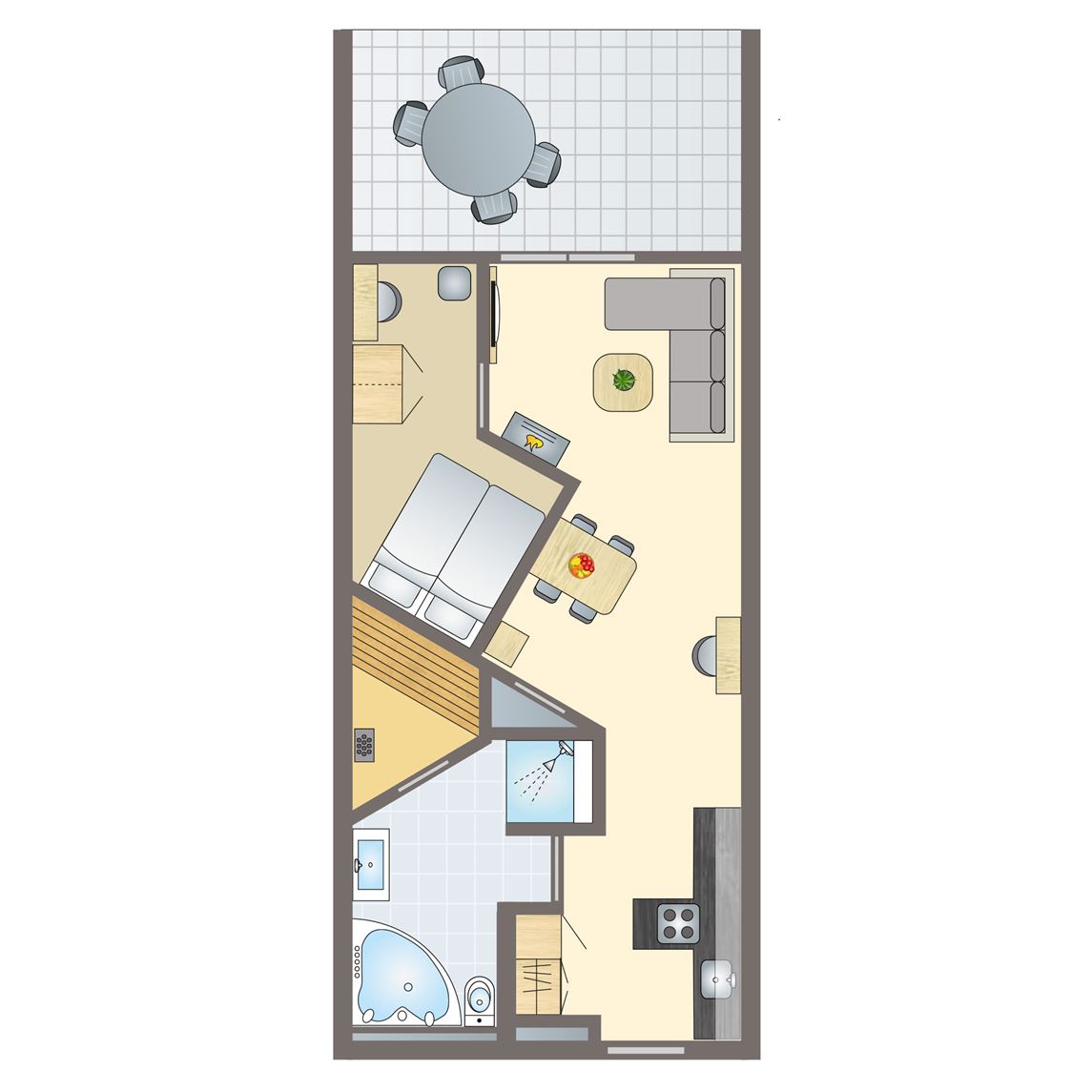 wifi tegen betaling,één slaapkamer,centrale verwarming,gelijkvloers,circa 31 m²,geschakeld,gasplaat (4 pits),koffiezetapparaat,open keuken,standaard keukeninventaris,koelkast met vriesvak,waterkoker,magnetron,badkamer met douchecabine, wastafel en toilet,kinderstoel,kinderbed,eethoek,radio,cd speler,flatscreen tv,spellendoos,zithoek,parasol,terrasmeubilair,terras,parkeren op de centrale parkeerplaats,bedden voorzien van dekbedden en hoofdkussens,slaapkamer met twee 1 persoonsbedden4 persoons appartement