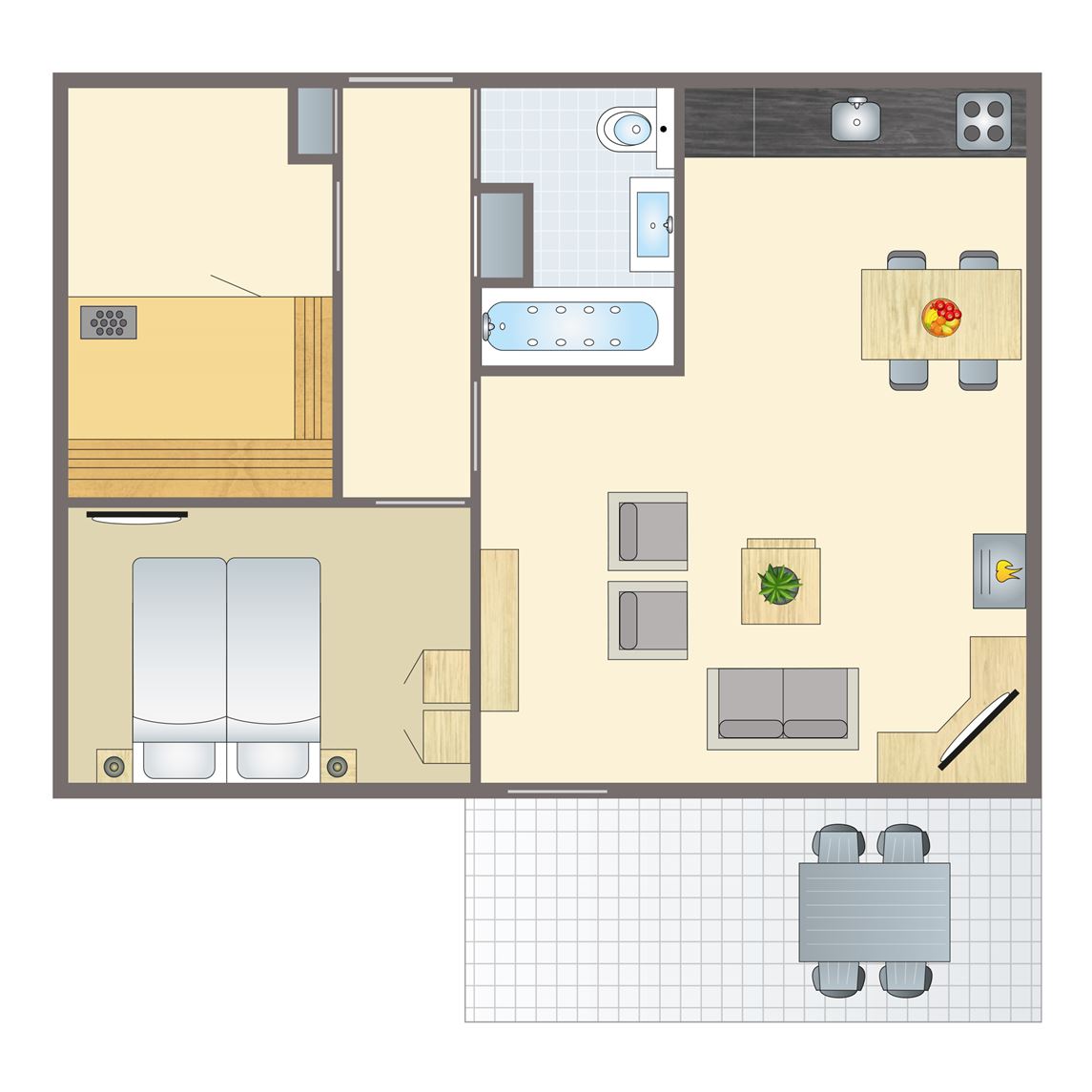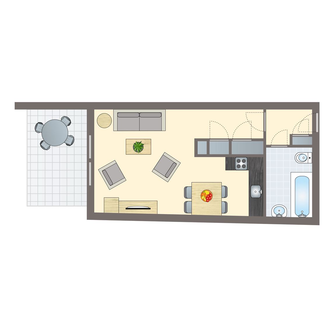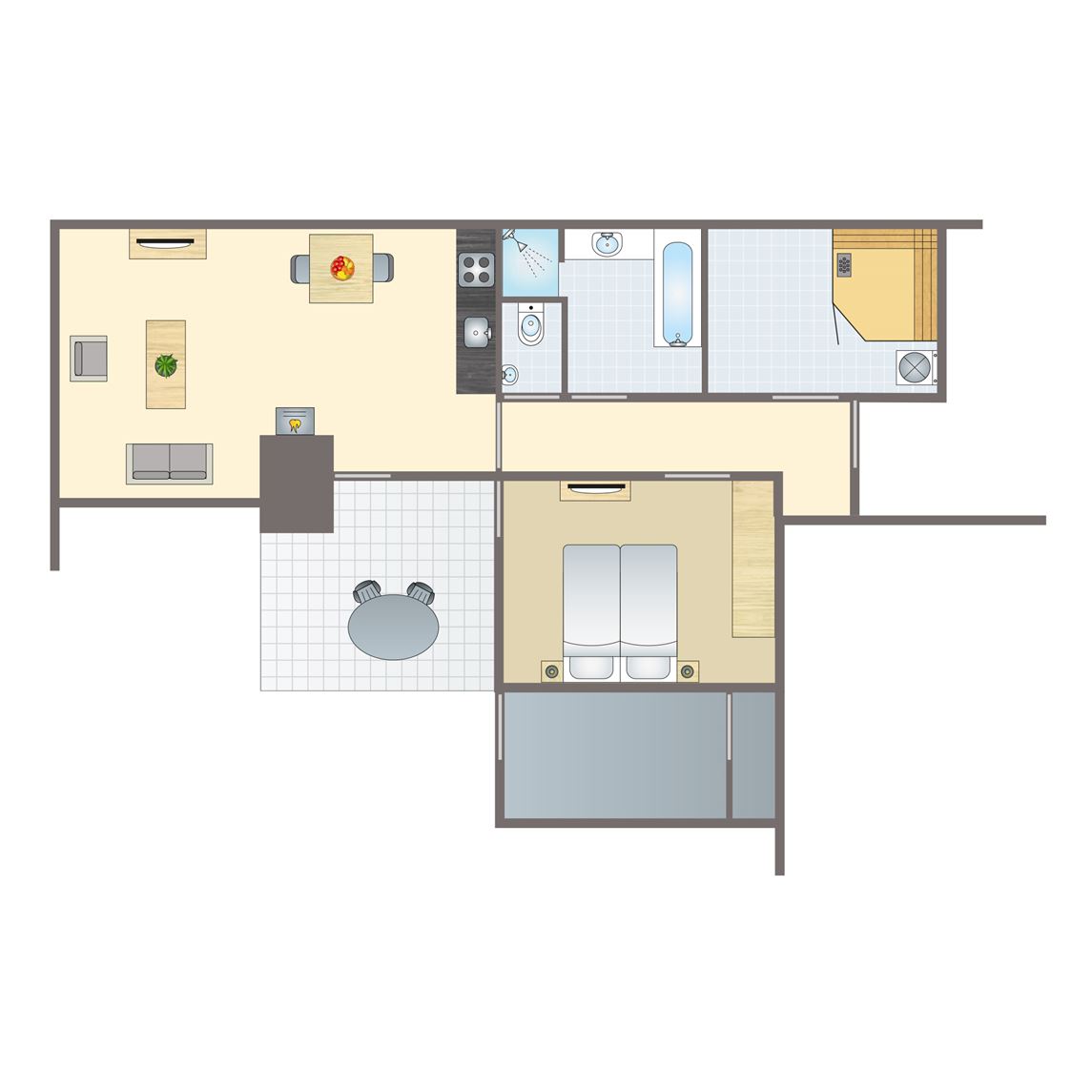 gratis wifi,vernieuwd interieur,stenen accommodatie,centrale verwarming,gelegen op de begane grond,in enkele accommodaties zijn huisdieren toegestaan,appartement,geen slaapkamer,gelijkvloers,rookvrij,circa 46 m²,smart tv,HDMI aansluiting,2 persoonsbed,zithoek,eethoek,kindveilige stopcontacten,kinderstoel (op aanvraag, tegen betaling),badkamer met inloopdouche, wastafel en toilet,koelkast met vriesvak,magnetron,oven,standaard keukeninventaris,vaatwasser,waterkoker,filterkoffiezetapparaat,Nespresso koffiemachine,open keuken,inductiekookplaat (4 pits),terras,terrasmeubilair,parasol,parkeren op de centrale parkeerplaats4 persoons bungalow