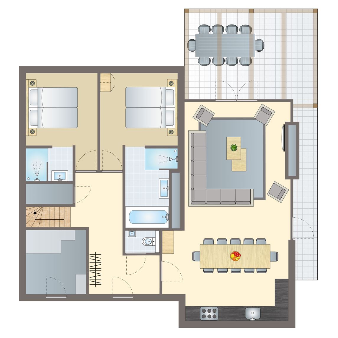 gratis wifi,modern interieur,vernieuwd interieur,geen lift aanwezig,bereikbaar via trap,inpandige berging,centrale verwarming,in enkele accommodaties zijn huisdieren toegestaan,drie slaapkamers,twee verdiepingen,rookvrij,circa 95 m² 124 m²,comfort,smart tv,HDMI aansluiting,zithoek,eethoek,traphekje,kinderstoel (op aanvraag, tegen betaling),campingbedje (tegen betaling),drie slaapkamers met twee 1 persoons boxsprings,bedden voorzien van dekbedden en hoofdkussens,badkamer met ligbad of vlakke douche en wastafel,badkamer met douche op de eerste verdieping,sommige accommodaties hebben een tweede badkamer met douche op de eerste verdieping,apart toilet,apart toilet op de eerste verdieping,koelkast met vriesvak,magnetron,oven,standaard keukeninventaris,vaatwasser,waterkoker,filterkoffiezetapparaat,Nespresso koffiemachine,open keuken,inductiekookplaat (4 pits),balkon,terrasmeubilair,autovrij park,parkeren op de centrale parkeerplaats6 persoons appartement