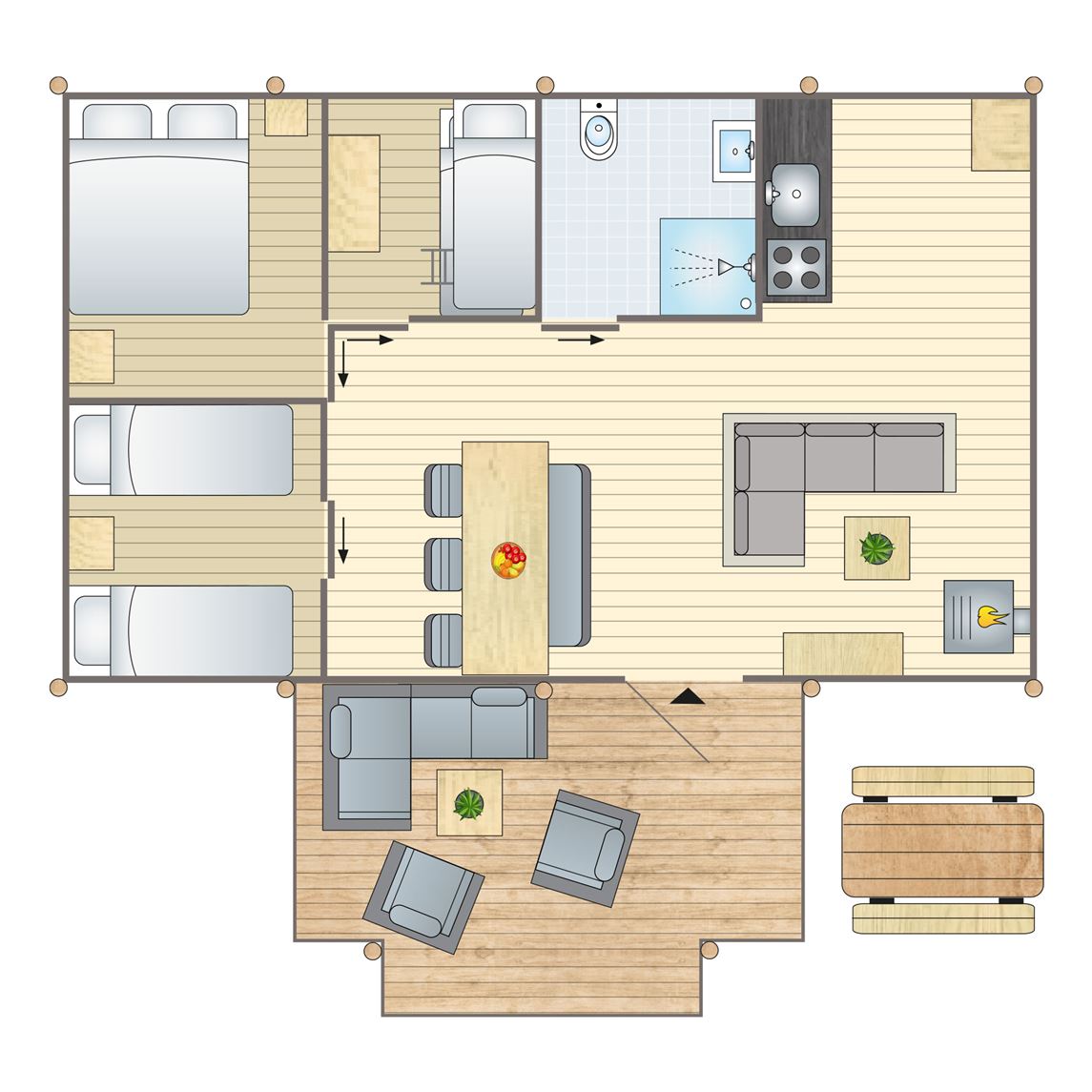 gratis wifi,enkele accommodaties zijn alleen bereikbaar per trap,elektrische verwarming,huisdiervrij,vrijstaand,drie slaapkamers,gelijkvloers,rookvrij,circa 40 m²,2 persoonsbedstee,zithoek,pelletkachel (gedeeltelijke verwarming),eethoek,Kinderzitje (op aanvraag en tegen betaling),campingbedje (op aanvraag),er is beperkte ruimte voor het bijplaatsen van een kinderbed,bedden voorzien van dekbedden en hoofdkussens,badkamer met douchecabine, wastafel en toilet,magnetron,standaard keukeninventaris,koelkast,filterkoffiezetapparaat,open keuken,inductiekookplaat (4 pits),veranda,terrasmeubilair,parkeren in de buurt van de accommodatie18 persoons reuniebungalow