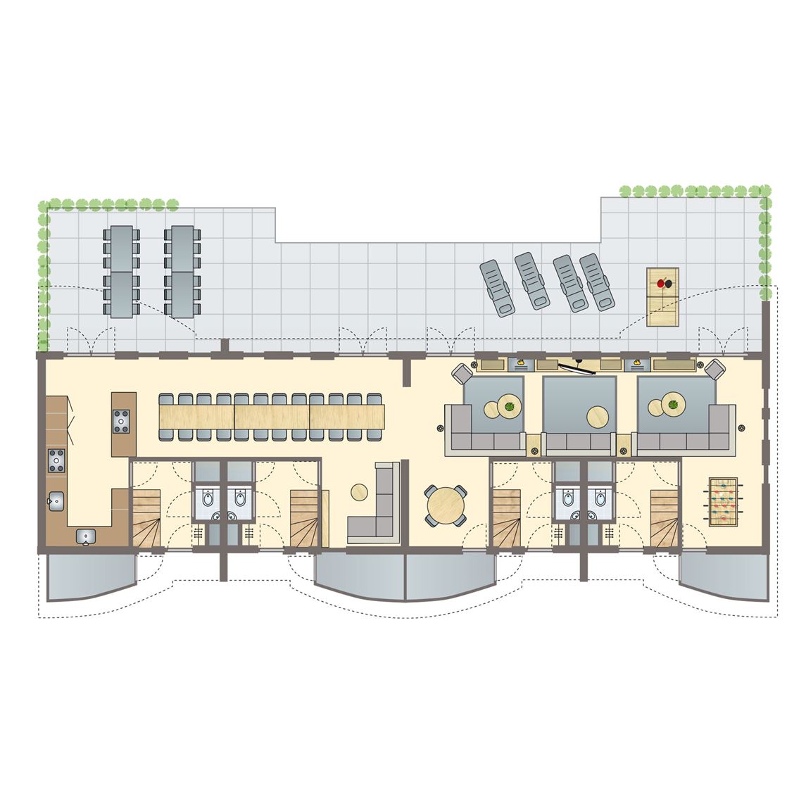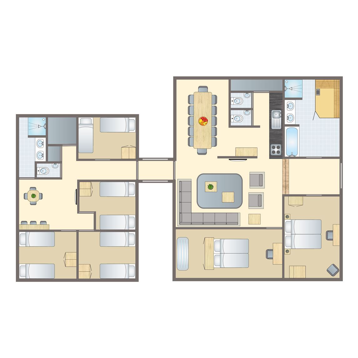 gratis wifi,centrale verwarming,twee huisdieren toegestaan,vrijstaand (4 gebouwen),gelijkvloers,Energy label D,rookvrij,negen slaapkamers,circa 51 m²,comfort,terras bij iedere accommodatie,deels verstelbaar terrasmeubilair,parasol,maximaal één auto parkeren per slaapaccommodatie,combimagnetron,vaatwasser,standaard keukeninventaris,aparte vriezer,grote koelkast,waterkoker,Senseo koffiezetapparaat in iedere accommodatie,koffiezetapparaat,gasplaat,extra grote keuken in de groepsaccommodatie en aparte keuken per slaapaccommodatie,per accommodatie één apart toilet,per slaapaccommodatie één badkamer met ligbad en wastafel,ruime eethoek,de huiskameraccommodatie is ingericht als grote huiskamer voor 18 personen met een grote eetkeuken,zithoek,digitale tv met radio,spellendoos,ruime woonkamer,kinderstoel,campingbedje,kindveilige stopcontacten,per slaapaccommodatie één slaapkamer met twee 1 persoons boxsprings, softtopper en wastafel,per slaapaccommodatie twee slaapkamers met twee 1 persoons boxsprings,bedden voorzien van dekbedden en hoofdkussens8 persoons bungalow